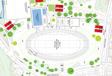 Isbanens ovale planform følger en kurve i den tilgrensende veien. Isbanen er plassert halv underjordisk for en bedre energiprestasjon. Idrettssenteret er planlagt til bruk av besøkere fra regionen, beboerne i selve bydelen og til bruk for en nærliggende skole.